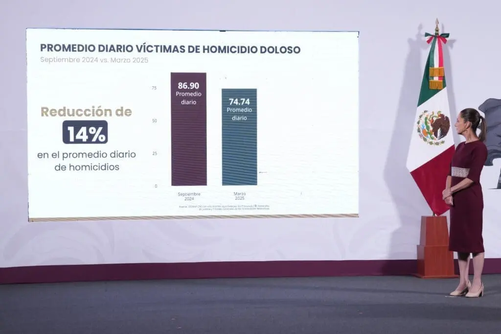 La secretaria ejecutiva del Sistema Nacional de Seguridad Pública, Marcela Figueroa Franco, destacó que en el primer semestre de la administración de la Presidenta, de septiembre de 2024 a marzo de 2025, se registró una disminución del 14 por ciento en el promedio diario de víctimas de homicidio doloso.