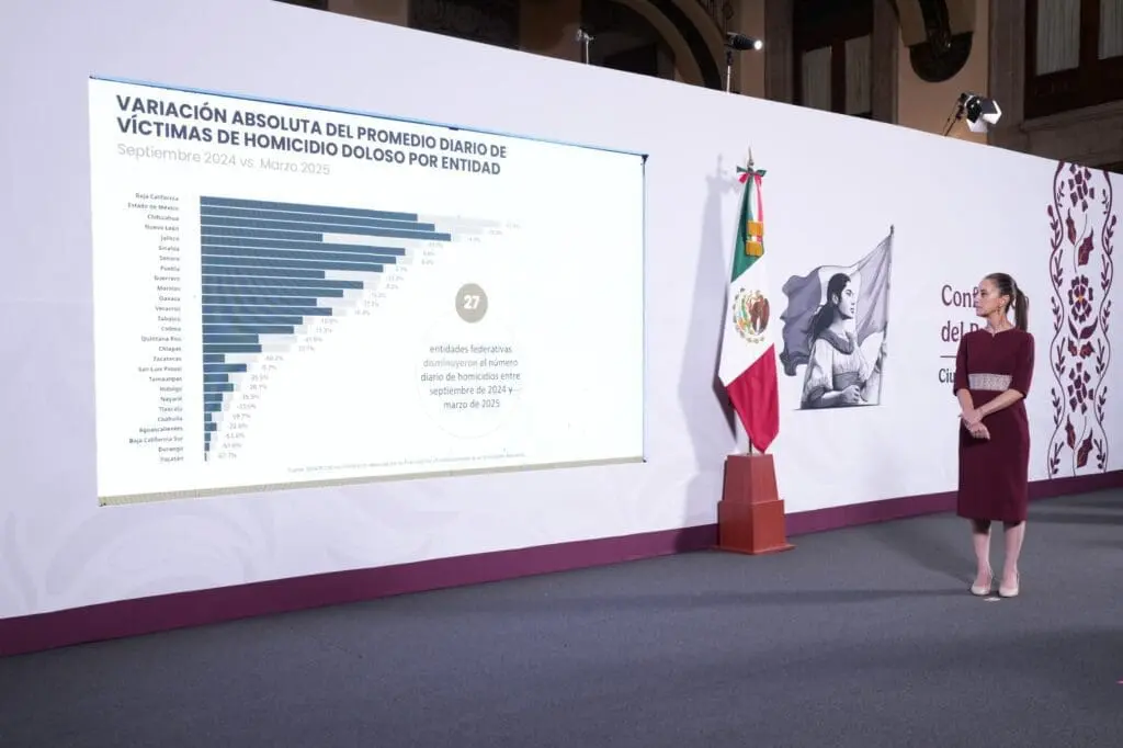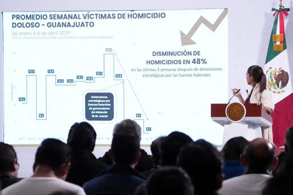 Aseguró que derivado de los esfuerzos para el reforzamiento de la seguridad, en Guerrero durante los últimos seis meses el homicidio ha tenido una reducción del 46 por ciento; en Guanajuato del 48 por ciento en las últimas tres semanas. En Tabasco del 42.2 por ciento del 15 de febrero a la fecha. En Baja California del 31.3 por ciento entre septiembre de 2024 y marzo 2025. En Sinaloa, del 25.8 por ciento entre octubre de 2024 y marzo de 2025.